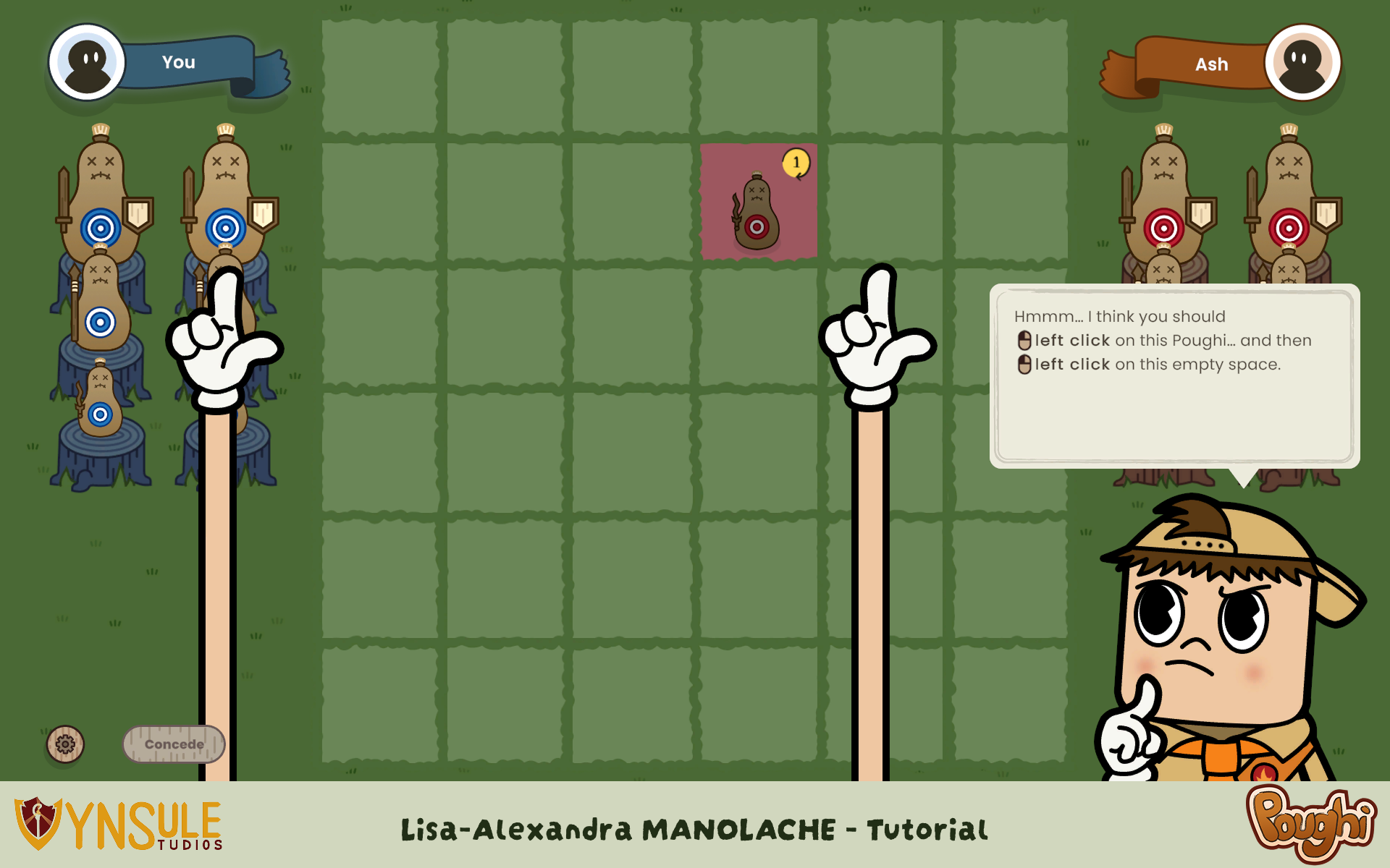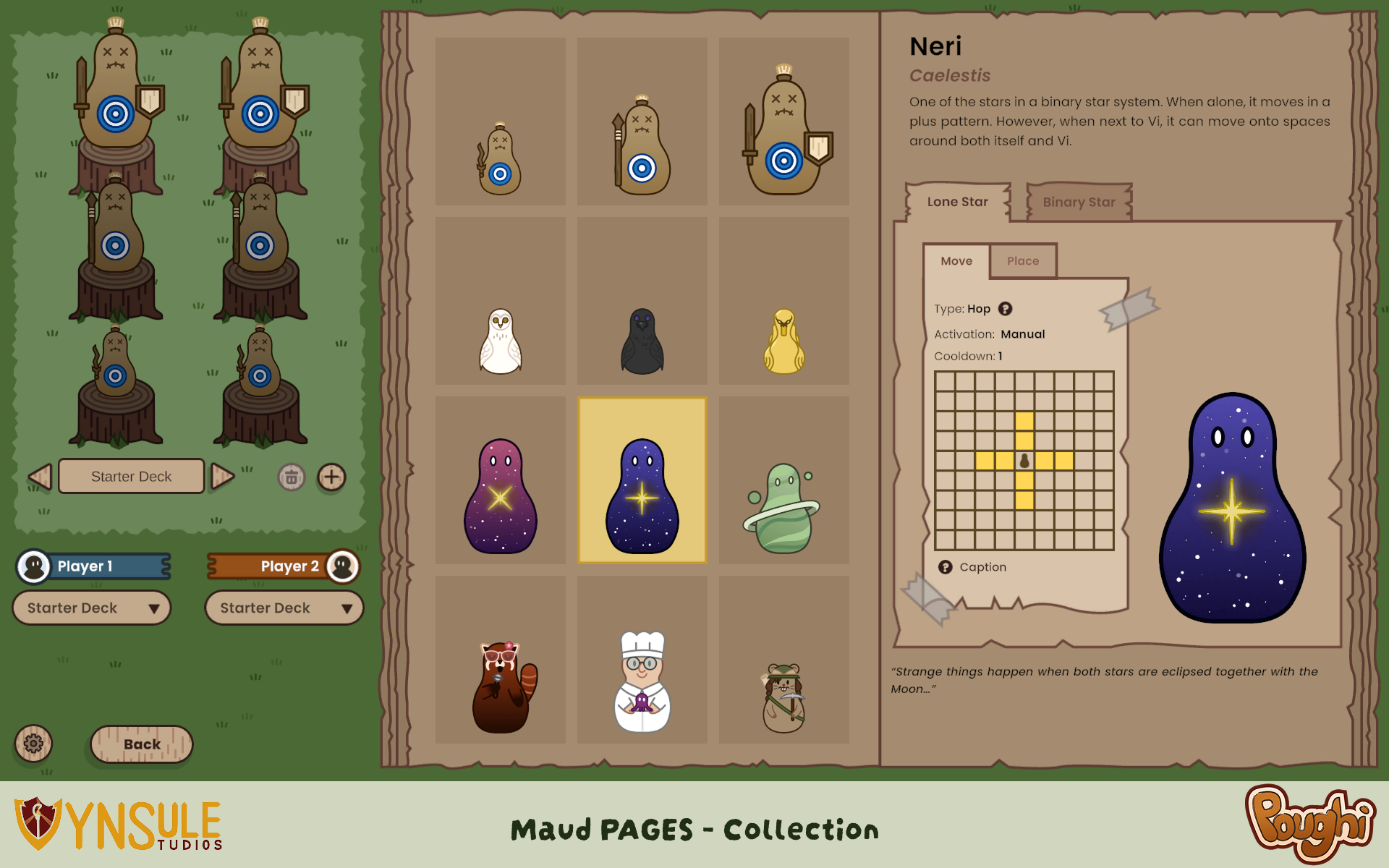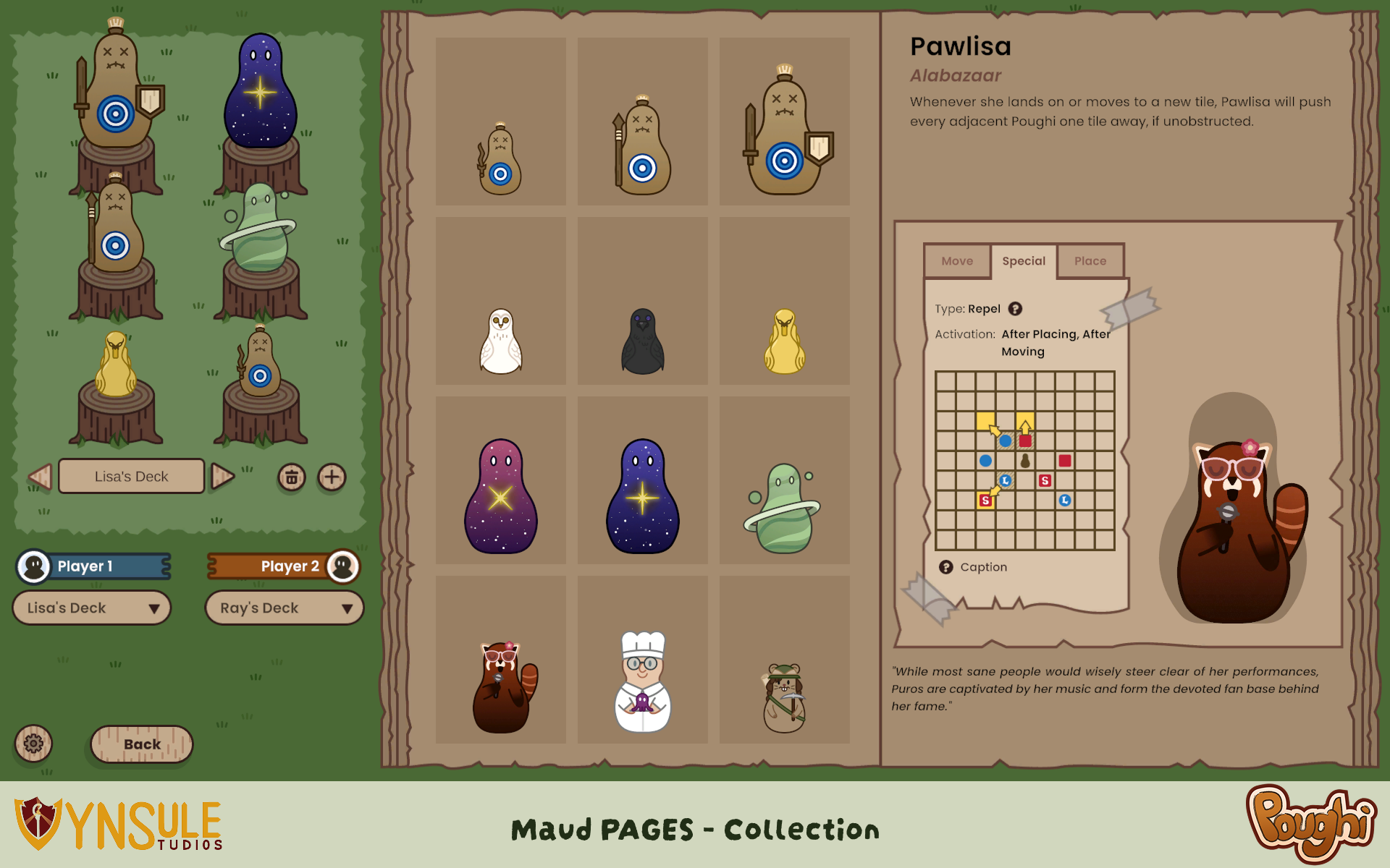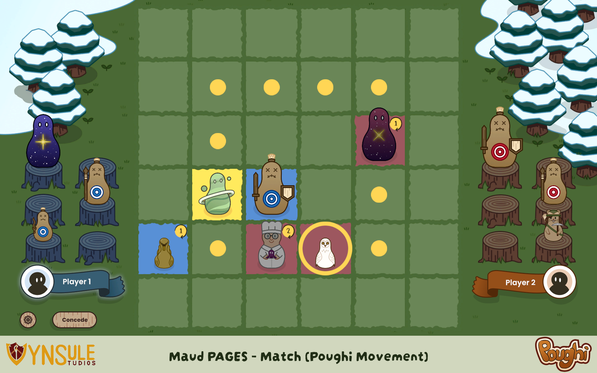 - Player abilities, special actions that can be activated only once during the match, such as resetting the cooldown of a Poughi or returning a Poughi to your hand.